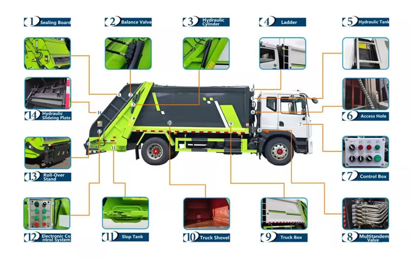 ●Il compattatore a caricamento posteriore da 10 m³ è costituito principalmente da un contenitore per i rifiuti, un caricatore, una piastra di spinta a compressione, un sistema idraulico, un sistema di controllo elettronico e una sponda posteriore.