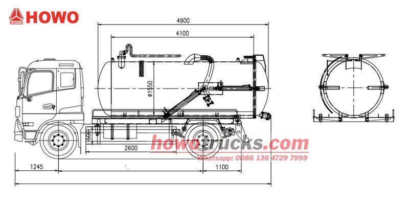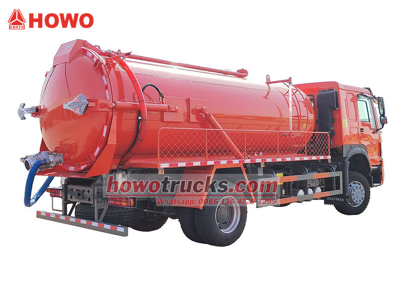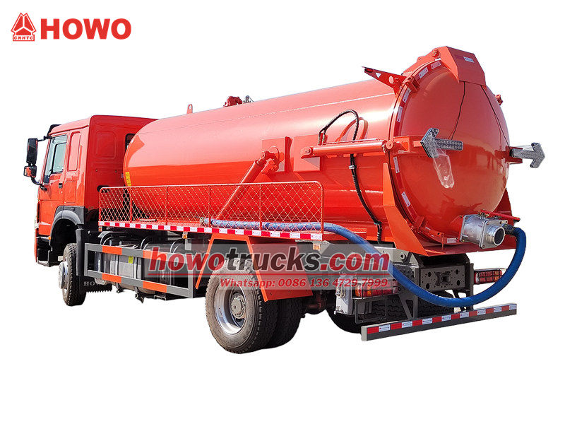 L'autocisterna per l'aspirazione delle acque reflue Howo da 300 CV utilizza un telaio Howo 4×2 con un passo di 4600 mm. È equipaggiata con un motore diesel WP10.300E22 da 300 CV con una cilindrata di 9,726 litri, abbinato a un cambio HW13710 e a un sistema di sterzo ZF8198, e 7 pneumatici 295/80R22.5, che garantiscono potenza e stabilità elevate. La cisterna è realizzata in acciaio al carbonio di alta qualità, che la rende robusta e durevole, ed è dotata di un sistema di pompaggio del vuoto ad alta efficienza, con funzioni di autoadescamento, autodrenaggio e autoscarico.