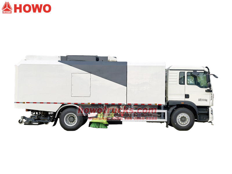 The Howo 12cbm hydro jetter road sweeping truck is a professional road sweeping equipment positioned in the medium-to-heavy-duty market. Built on the Howo TX chassis, it features a 4600mm wheelbase and a gross vehicle weight of 18,000kg. Its design balances flexibility and operational stability, allowing it to move easily through various scenarios such as city streets and industrial parks without space constraints. The vehicle offers optional left/right-hand drive to suit different regional needs. The cab is equipped with air conditioning, and the manual tilt design combined with mechanical suspension significantly improves driver comfort, making it suitable for long-term cleaning operations.