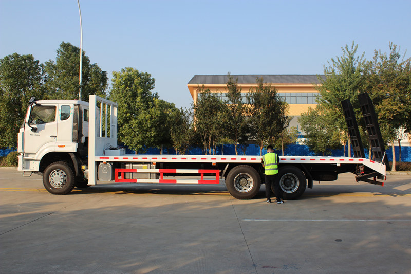 Il semirimorchio autocarrato a pianale HOWO da 25 tonnellate è costruito sul telaio per impieghi gravosi SINOTRUK HOWO ed è equipaggiato con un potente motore Weichai WP10.380E53 da 380 cavalli, conforme agli standard Euro V sulle emissioni. La sua sovrastruttura presenta un pianale lungo 8.600 mm che può essere allargato idraulicamente fino a 3 metri. Il pianale è realizzato in lamiera d'acciaio antiscivolo da 10 mm e include stabilizzatori idraulici anteriori da 25 tonnellate, un verricello idraulico da 8 tonnellate e una rampa pieghevole idraulica da 2 metri. Ciò garantisce un trasporto e un carico/scarico sicuri ed efficienti di macchinari di grandi dimensioni, rendendolo ampiamente utilizzabile nei cantieri edili, nelle attività minerarie e nel trasporto logistico.