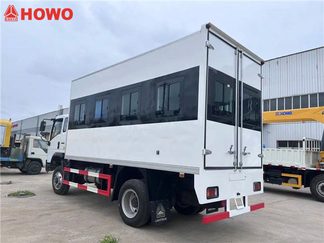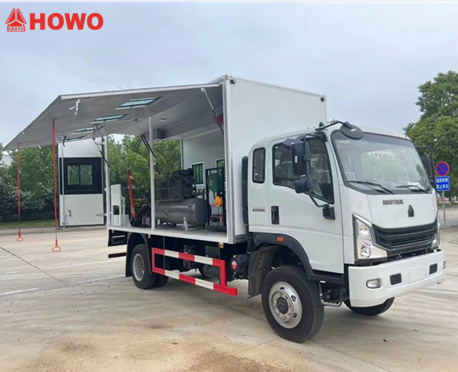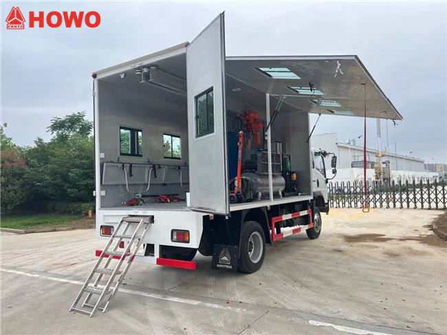 Il veicolo di manutenzione mobile HOWO 4x4 ha le seguenti configurazioni: cabina HOWO 1880 a fila singola, passo di 3360 mm, motore Weichai WP3NQ140E50, cambio WLY6G120, cassone del furgone di dimensioni 4200*2100*2000 mm, pannello laterale destro con design ad ala e supporto telescopico, finestrini, piastra inferiore in lega di alluminio, illuminazione interna e strumenti di manutenzione tra cui un compressore d'aria, un generatore, scaffali personalizzati, una gru idraulica a braccio pieghevole, un armadietto degli attrezzi, un sistema di rifornimentomacchina con ugello di rifornimento e avvolgitubo dell'olio da 10 metri, scala, bombole di ossigeno, bombole di acetilene, macchine per taglio a gas e saldatura idraulica, unaSmerigliatrice a disco manuale, due estintori, ecc.