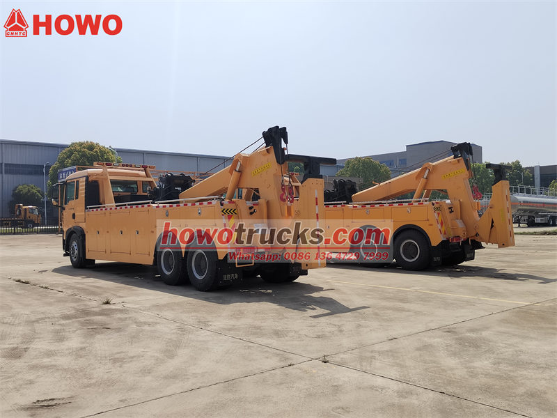 Il carro attrezzi Howo 6x4 è dotato di un robusto sistema di stabilizzatori idraulici (con una capacità di sollevamento di 12,5 tonnellate per stabilizzatore), che offre un'ampia base di appoggio e garantisce sicurezza e stabilità nelle operazioni di soccorso più impegnative. La lussuosa cabina gialla con una fila e mezza di posti letto (altri colori disponibili), il serbatoio carburante di grande capacità da 400 litri, l'impianto elettrico a 24 V, l'illuminazione di segnalazione completa (luci di segnalazione, luci stroboscopiche), la cassetta degli attrezzi e altri accessori lo rendono un mezzo di traino e soccorso professionale di grandi dimensioni, con funzionalità complete e prestazioni elevate.