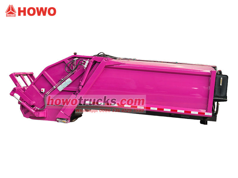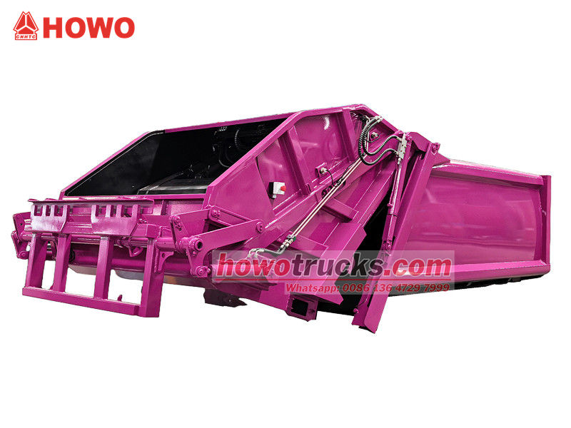 Sovrastruttura per autocompattatore per rifiuti Howo da 8 m³ (chiamata anche sovrastruttura per autocompattatore a caricamento posteriore, kit sovrastruttura per autocompattatore per rifiuti da 8 m³, sovrastruttura per autocompattatore per rifiuti, kit sovrastruttura per autocompattatore per rifiuti, kit per autocarro per la raccolta dei rifiuti a caricamento posteriore, ecc.) La parte superiore è un cassonetto per rifiuti da 8 m³, la parte posteriore è dotata di un meccanismo di ribaltamento del secchio; sono disponibili 3 metodi per le operazioni di carico e scarico del camion.