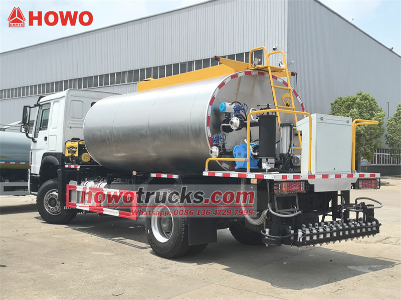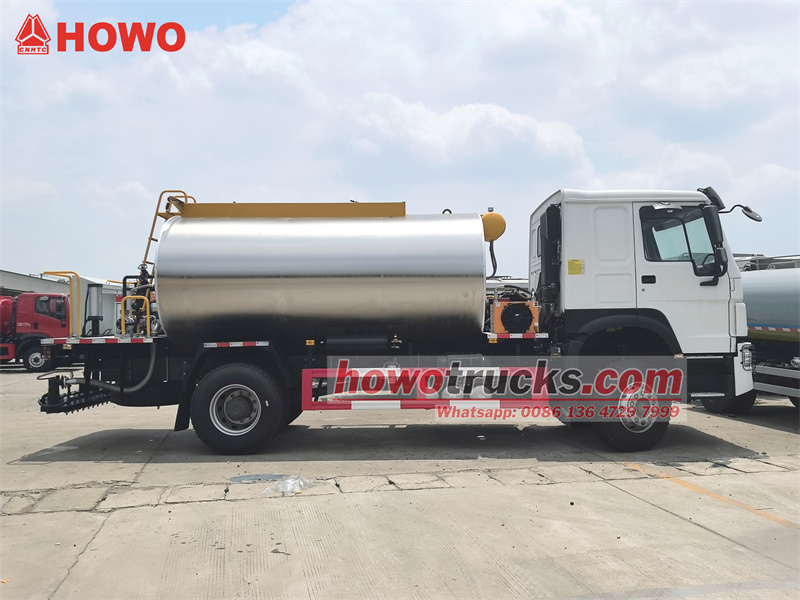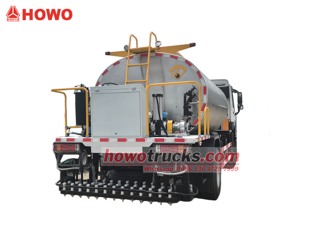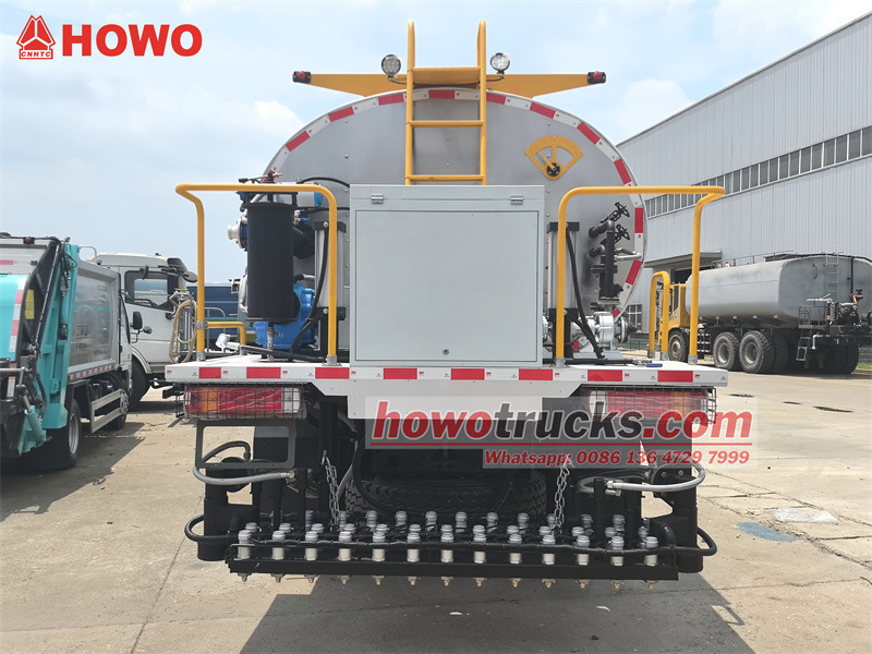 Il distributore di asfalto HOWO 4x2 da 8 metri cubi è un telaio con cabina HOWO HW76 modificato con un passo di 4600 mm. È equipaggiato con un motore WP10.300E22 e un cambio HW19710. La parte superiore è un serbatoio di asfalto da 8 metri cubi, dotato di una pompa di isolamento per asfalto intelligente RCB38/0.6-80F, 36 ugelli per asfalto nella parte posteriore, una larghezza di spruzzo di 6 m, un volume di spruzzo di 0,2-3 kg/m², un bruciatore diesel importato (potere calorifico: 10×10⁴kcal/h), riscaldamento automatico a olio termico, controllo computerizzato intelligente in cabina e gruppo elettrogeno ausiliario.