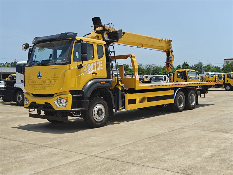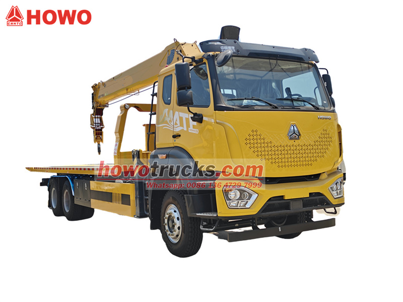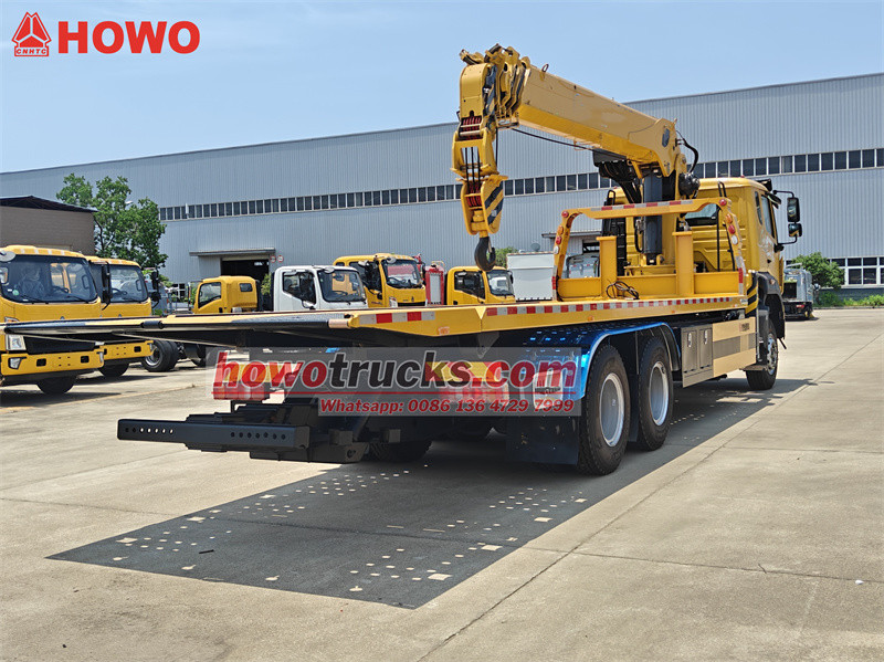 13000*2Questo Carro attrezzi Howo con pianale e gru da 8 tonnellate. Si tratta di un camion speciale versatile e ben progettato. È equipaggiato con un motore diesel di marca cinese Yuchai Engine, con una potenza di 260 CV, in grado di soddisfare diverse esigenze lavorative. La nuova cabina di lusso M9 può ospitare tre persone ed è dotata di aria condizionata, offrendo un ambiente di guida confortevole per conducenti e operatori. La gru è a braccio telescopico con una capacità di sollevamento massima di 8000 kg, rotazione completa a 360° e un'altezza di sollevamento massima di 16,5 m.