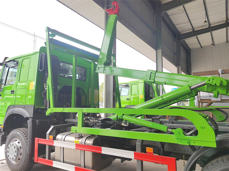 Equipped PALFINGER hooklift unit,sheeting SystemIL Caricatore a gancio HOWO con sistema di telone Si tratta di un autocarro per rifiuti con sistema di sollevamento a gancio per impieghi gravosi, costruito su un telaio HOWO 8x4, specificamente progettato per il trasporto di rifiuti solidi su larga scala. Il suo punto di forza è l'integrazione del sistema di sollevamento a gancio Palfinger T26 e dell'innovativa tecnologia di telonatura automatica a "rastrello telescopico". Il veicolo vanta una potente capacità di sollevamento di 26 tonnellate e può azionare idraulicamente il telone per sigillare automaticamente il contenitore dei rifiuti durante l'intero processo, prevenendo efficacemente la fuoriuscita di rifiuti e la dispersione di polvere durante il trasporto. Un esclusivo sistema di interblocco di sicurezza garantisce che i sistemi di sollevamento a gancio e di telonatura non possano funzionare simultaneamente, evitando interferenze e danni alle apparecchiature e garantendo la sicurezza operativa. È dotato di un collaudato sistema di telonatura originale, compatibile con tutte le attrezzature di carico e scarico a gancio presenti sul mercato. Consente un funzionamento efficiente ed ecologico durante l'intero processo, dal carico, scarico e trasferimento alla sigillatura, rendendolo un potente strumento per impieghi gravosi per la moderna gestione dei rifiuti urbani.