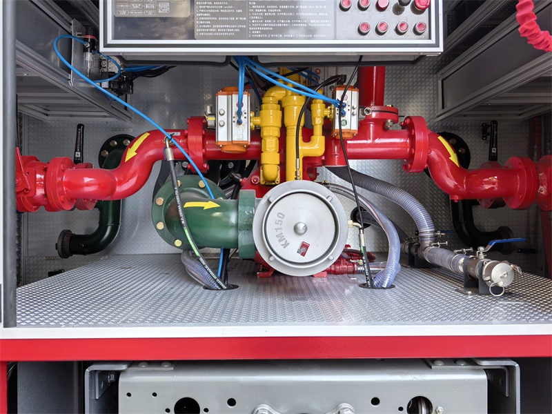 Sistema del serbatoio: La parte anteriore è adibita a locale attrezzature, dove sono riposte varie attrezzature antincendio (come manichette, estintori, asce, chiavi inglesi, martelli, picconi, ecc.) per un facile accesso. Al centro, si trovano un serbatoio d'acqua in acciaio al carbonio da 6 m³ e un serbatoio di schiuma da 2 m³, entrambi dotati di boccaporti sulla parte superiore.
