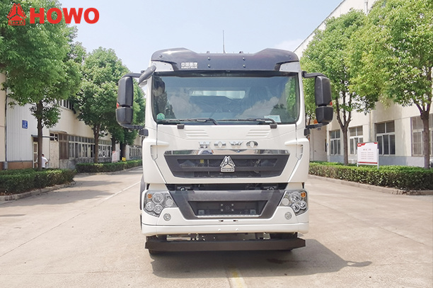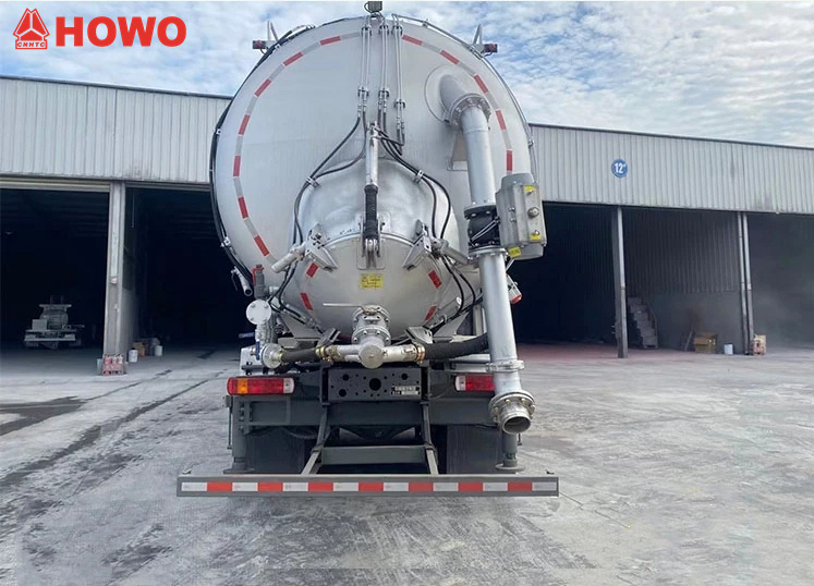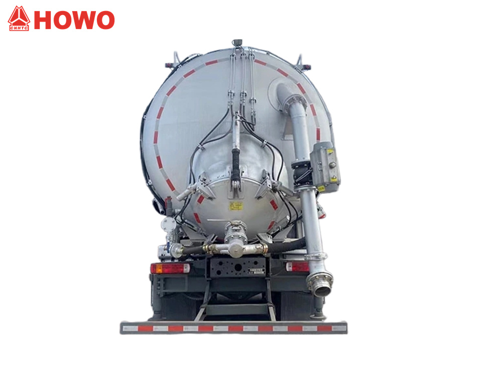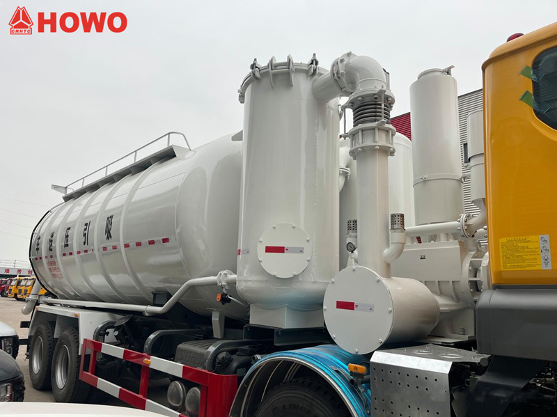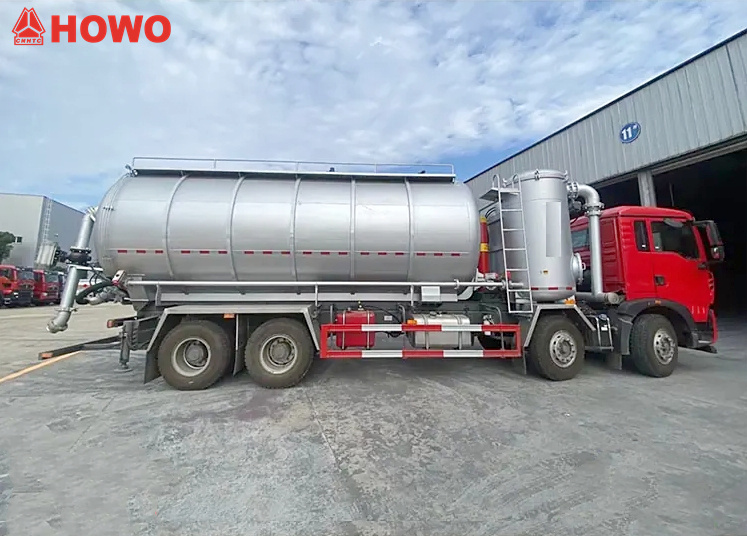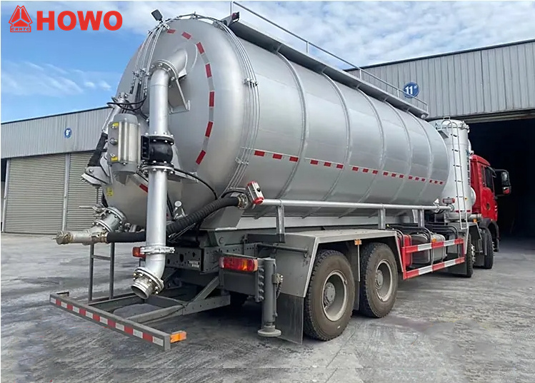 Veicolo trasportatore a pressione e aspirazione HOWO 8x4 da 25 m³, modificato su telaio HOWO TX350 8x4, con un passo di 1800+4600+1350 mm, equipaggiato con motore Sinotruk MC07H.35-60 e cambio HW15710L. La parte superiore del cassone è completamente dotata di filtri a sacco, mentre la parte posteriore ospita un serbatoio di stoccaggio. È equipaggiato con stabilizzatori idraulici, ventilatori, tubi di aspirazione dell'aria esterna, pompe per vuoto, compressori d'aria, cilindri di sollevamento, sistemi di filtrazione, sistemi di tubazioni di aspirazione e mandata, centraline elettroniche, ecc. La pompa per vuoto ha aspirazione a pressione negativa e il compressore d'aria ha mandata a pressione positiva.