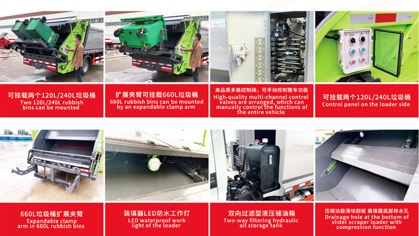➤Il metodo di scarico dei rifiuti con ribaltamento posteriore, combinato con un dispositivo di sollevamento idraulico, rende lo scarico dei rifiuti più rapido e pulito.